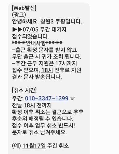 처음 신청을 할 때 3일 연속 신청이 가능해서 했는데 다음날은 티오가 없다고 근무할 수 없다고 문자가 왔더라고요.
