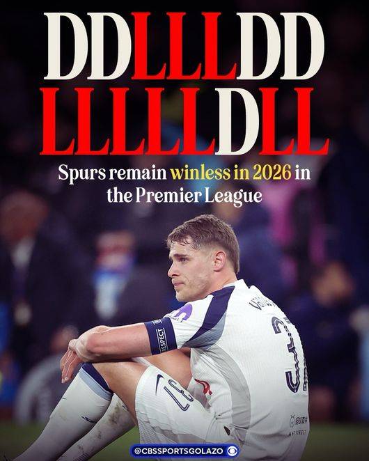 이날 패배로 토트넘은 리그 14경기 연속 무승(5무 9패)의 늪에 빠졌다. 지난해 12월 말 크리스탈 팰리스전 이후 승리가 없다. 이고르 투도르 임시 감독의 뒤를 이어 지휘봉을 잡은 데 제르비 감독도 최악의 흐름을 끊어주지 못했다. 2026년 들어 아직도 승리가 없는 프리미어리그 팀은 토트넘이 유일하다.
