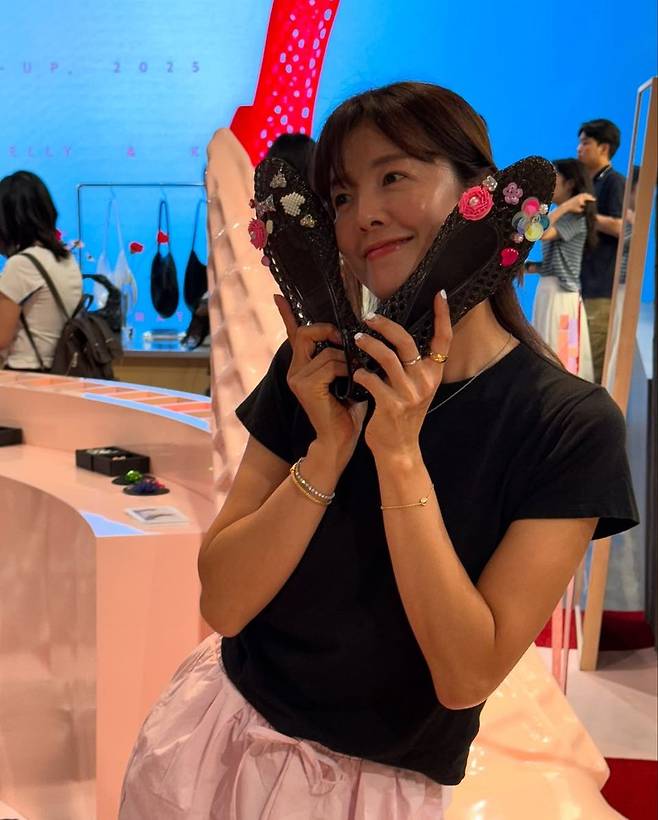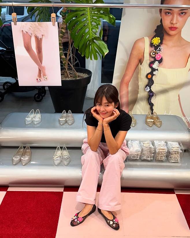 사진 속 김성은은 분홍색 조거 팬츠와 블랙 티셔츠를 매치해 편안하면서도 감각적인 캐주얼룩을 완성했다. 바닥에 앉아 두 손 가득 젤리슈즈를 들어 보이며 환한 미소를 지은 모습은 보는 이들에게도 기분 좋은 에너지를 전한다.