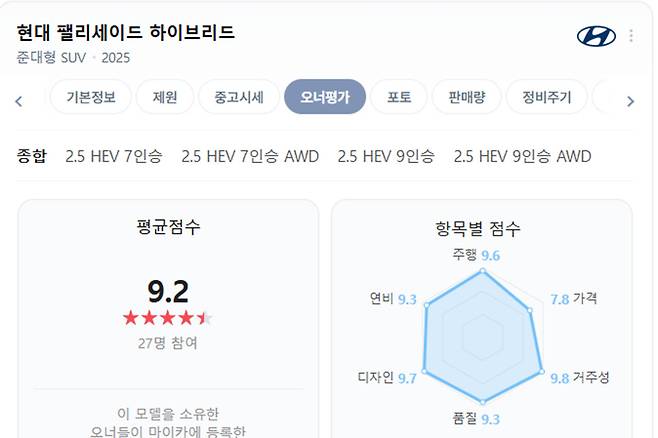 실제 차주들의 평가를 기반으로 차량 만족도 점수를 공개하는 ‘네이버 마이카 오너평가’에 따르면 현대차 팰리세이드 하이브리드의 오너평가 점수는 9.2점이다.