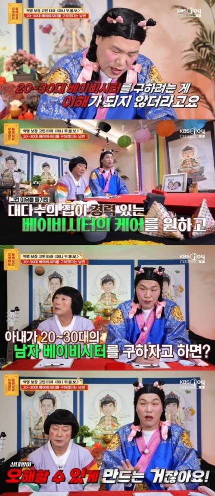 이수근은 “남편이 정신을 바짝 차려야 한다”고 쓴소리했다. 그는 “베이비시터는 경력이 많은 분이 해줘야 한다”며 “20~30대 베이비시터를 찾아봐라. 없다”고 덧붙였다. 또 “반대로 생각해서 아내가 혼자 있는데 20~30대 남자 베이비시터를 쓴다고 하면 좋냐”며 ‘말 같지 않은 소리’라고 표현했다.