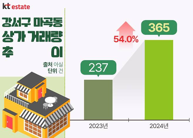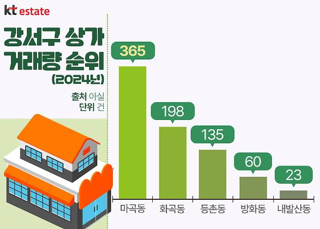 부동산 빅데이터 업체 ‘아실’의 상가 통계 데이터를 살펴보면, 지난 한 해 강서구 마곡동의 상가 거래량은 365건으로 2023년 237건과 비교해 무려 54.0%나 증가한 바 있습니다. 최근 경기 침체로 상가 거래량이 감소하는 추세와 비교해 보면 이러한 성장세는 눈에 띕니다.