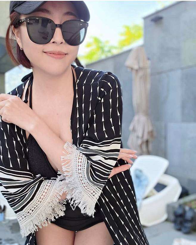 블랙 수영복에 에스닉 패턴의 로브를 걸쳐 휴양지 특유의 여유롭고 감각적인 리조트룩을 연출했습니다.