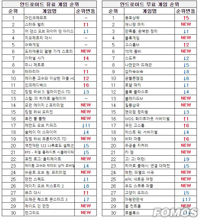 유료 게임 순위에서는 카이로소프트의 신작 '도라에몽의 팥빵 가게 스토리'가 출시와 함께 2위를 차지했다.