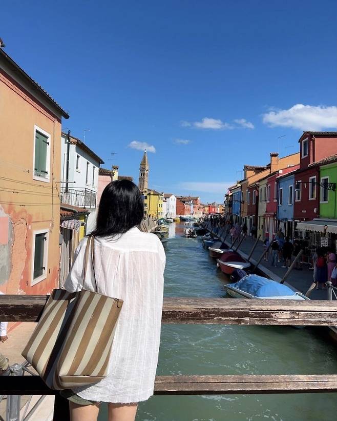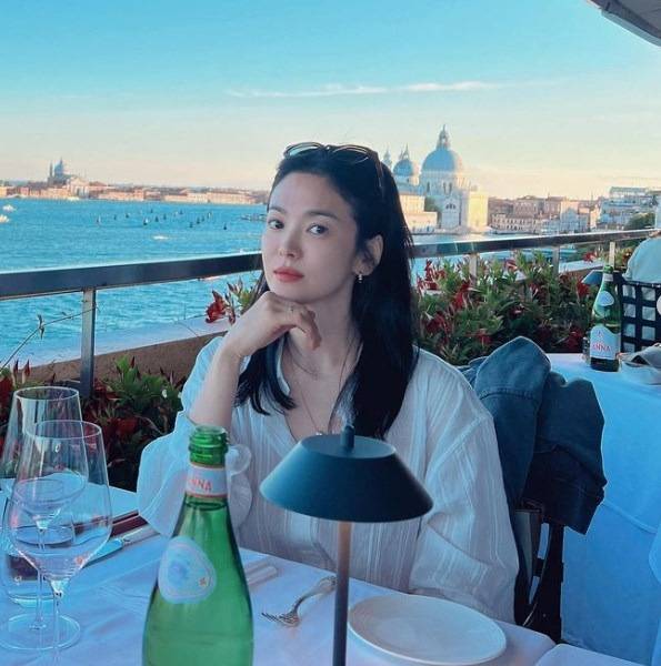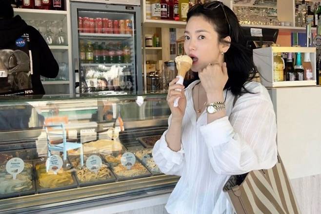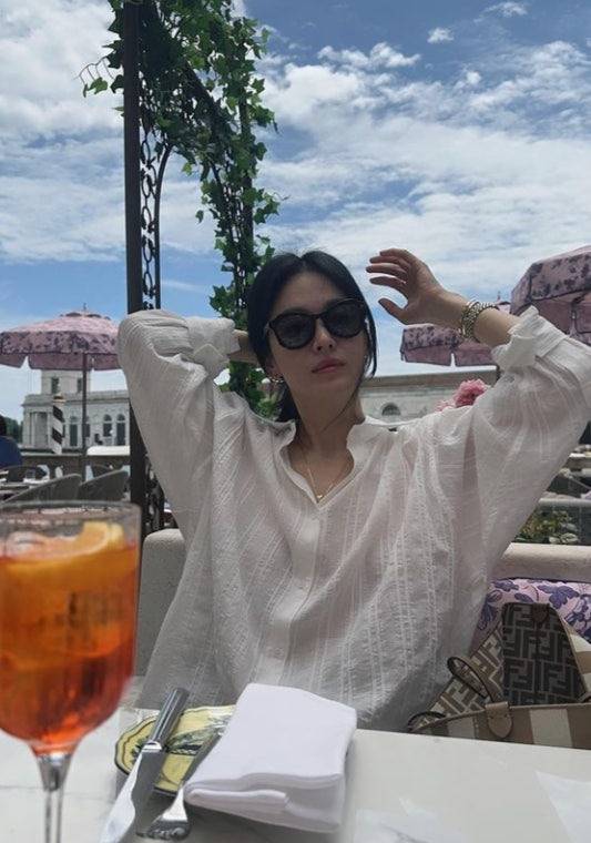 송혜교는 여기에 따로 화려한 액세서리를 더하지 않아도, 셔츠 하나만으로 여행지의 분위기와 자연스럽게 어우러지는 세련된 이미지를 완성했다.