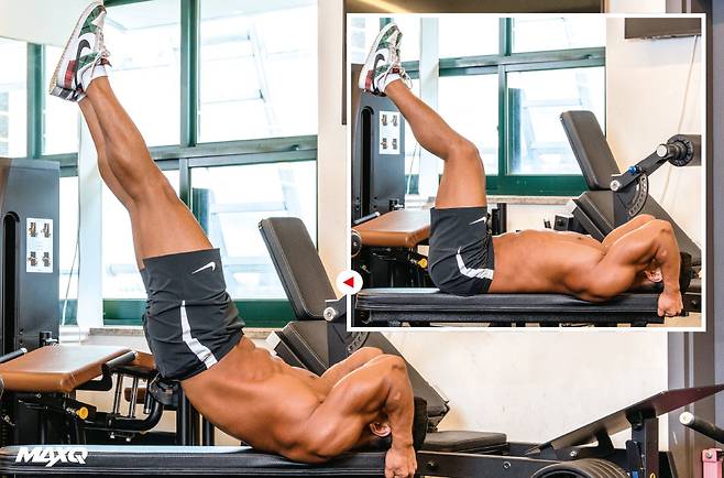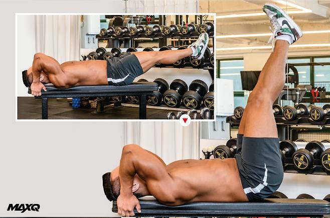벤치에 눕고 양손으로 상단을 잡아 몸을 고정한다. 양 다리를 높게 들어 ‘L’ 자를 만든다. 무릎이 구부러지지 않도록 주의하며 양 다리를 내린다. 천천히 준비자세로 돌아온다.