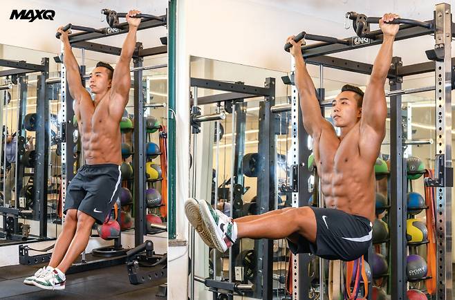 “다른 복근운동과 달리 가동범위가 넓어서 하복부를 비롯해 복근 등 상체 전반을 단련하는 데 효과적인 운동입니다. 바에 매달린 상태에서 골반을 가슴 쪽으로 살짝 당겨 허리가 뒤로 젖혀지지 않게 잡아주세요.”