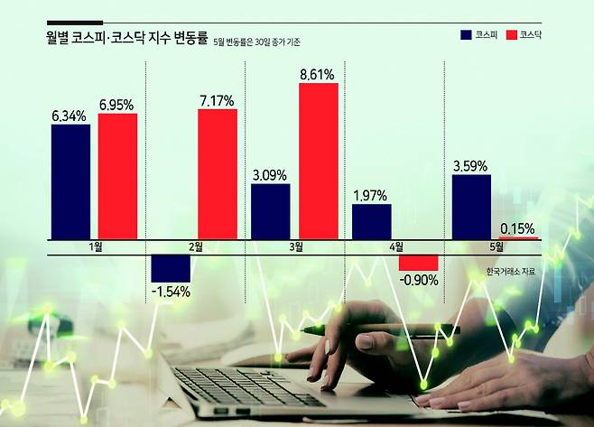 ‘5월엔 주식을 팔고 떠나라(셀인메이·Sell in May)’란 증시의 오랜 격언이 올해 코스피 시장에선 통하지 않았다. 반도체 대형주의 강세에 힘입어 코스피 지수가 상승세를 보였고 조정세를 보여왔던 코스닥 지수도 상승 전환하는 데 성공했다. 국내 증시 상승세가 6월에도 당분간 유지될 것이란 전망도 이어지고 있다.