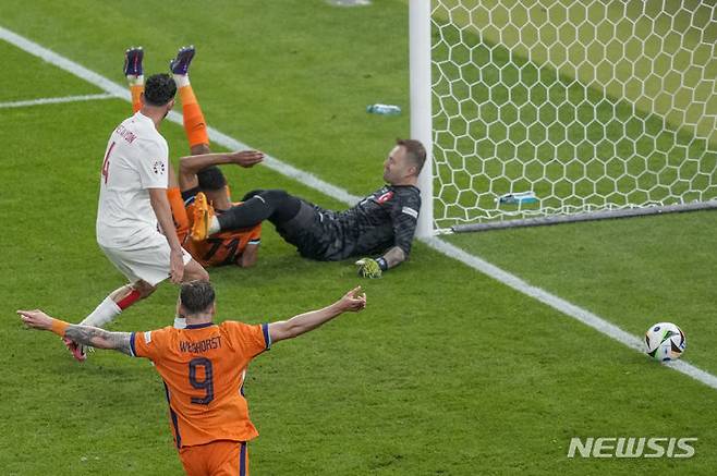[베를린=AP/뉴시스] 네덜란드(7위)의 코디 학포(왼쪽)가 6일(현지시각) 독일 베를린의 올림피아 슈타디온에서 열린 유로 2024 8강전 튀르키예(42위)와 경기 후반 31분 팀의 두 번째 골을 넣고 있다. 이 골은 튀르키예 메르트 뮐뒤르의 발에 맞아 자책골로 기록됐다. 네덜란드는 스테판 더 프레이의 동점 골과 상대 자책골로 튀르키예를 2-1로 꺾고 20년 만에 4강에 올랐다. 2024.07.07.
