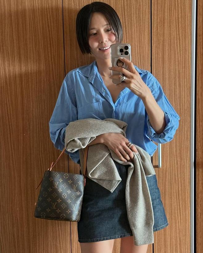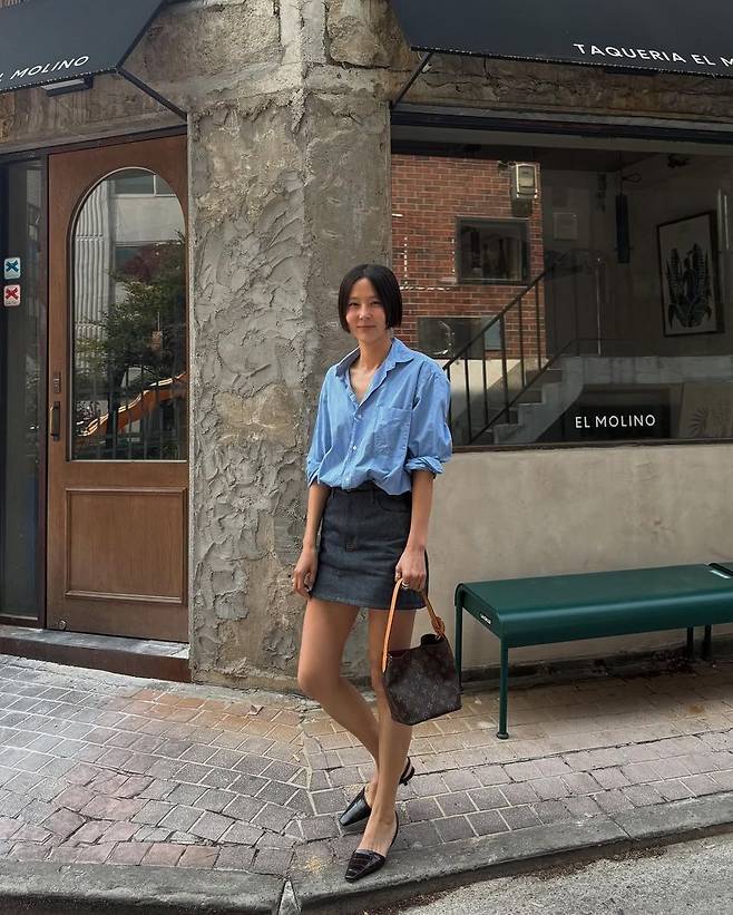 비슷한 스타일을 시도해보고 싶다면 기본 블루 셔츠에 미니 데님스커트를 매치하고, 그레이 컬러의 니트 혹은 가디건을 살짝 걸치는 방식으로 연출하면 된다. 여기에 클래식한 로고백 하나만 더해도 충분히 김나영 무드에 가까운 데일리룩을 완성할 수 있다.