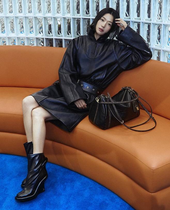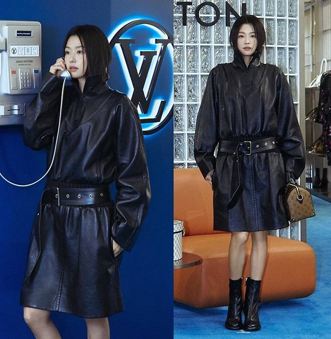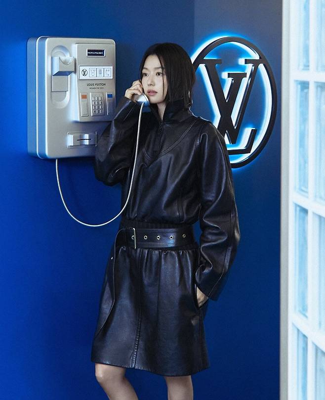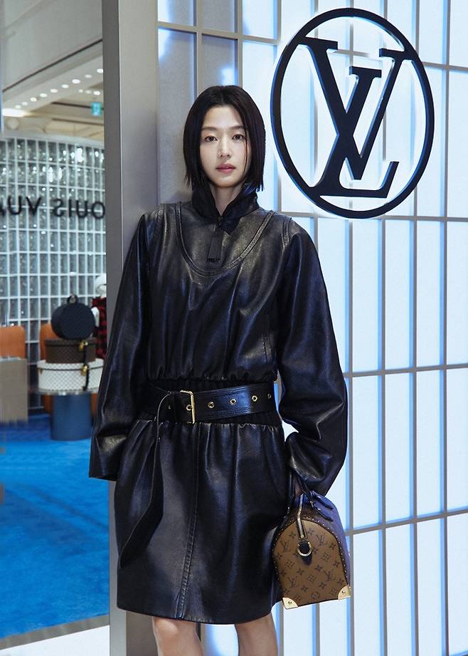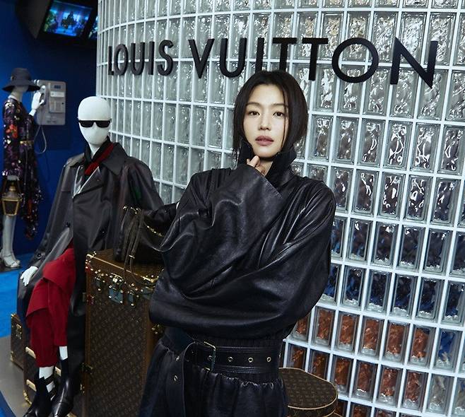 오픈 첫날 가죽 코트룩으로 매장을 방문한 전지현은 루이 비통의 아이코닉한 ‘스피디(Speedy)’ 백에서 영감을 받은 '익스프레스(Express)’ 백, 라운지 체어에서 영감을 받은 라운지 웨지 앵클 부츠를 착용해 특유의 우아하고 세련된 분위기를 연출했다.