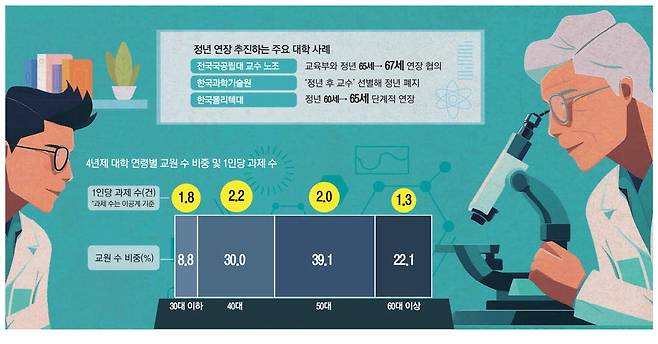 하지만 교수들의 성과와 업적은 고령화에 반비례했다. 60대 이상 전임 교수들이 처리한 1인당 과제 수는 다른 연령대 교수들에 비해 낮았다. 이공계 분야의 경우 60대 이상 전임 교수의 1인당 과제 수는 1.34건이었다. 40대 2.26건, 50대 2.05건, 30대 이하 1.87건에 못 미쳤다.