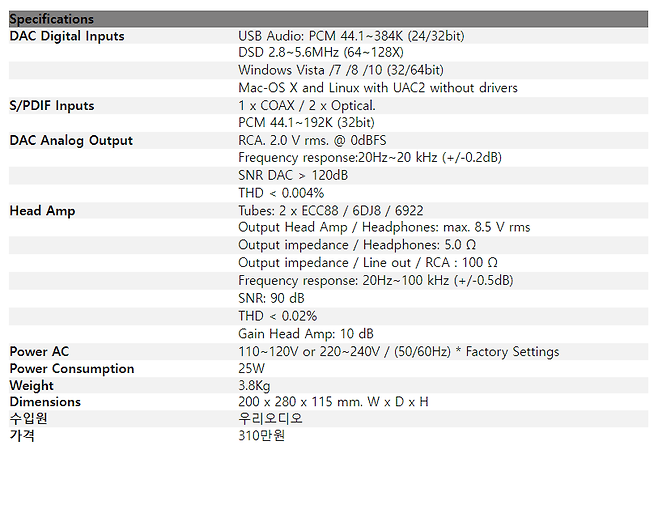 여기서 놀란 것은 왜율이다. 거의 디스토션이 없다. DAC는 0.004%에 불과하고, 헤드폰 앰프는 0.02%에 달한다. 진공관을 쓰고 이 정도 스펙을 구현한 것은, 본 기의 높은 성능을 단적으로 볼 수 있는 내용이라고 본다.