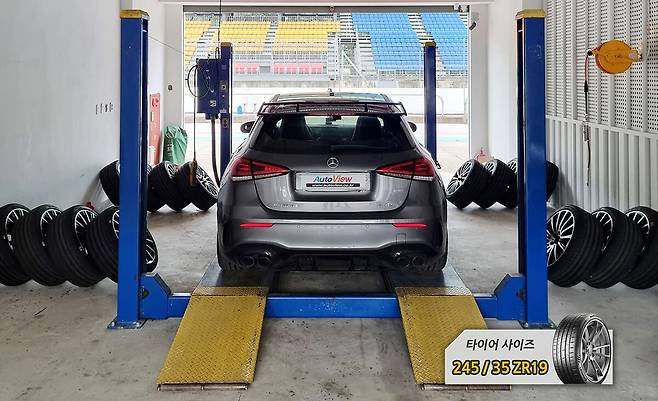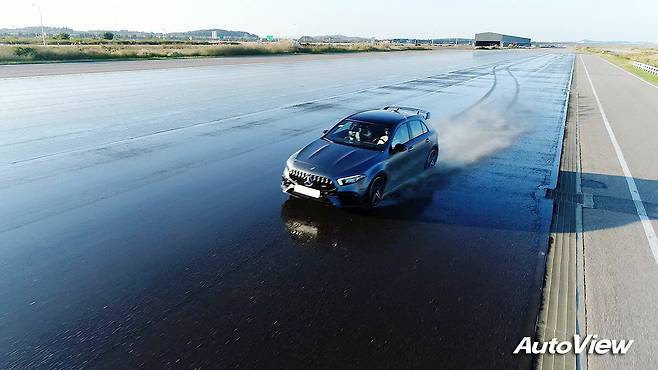 시험에 쓰인 차는 AMG A45 4Matic+다. 준중형급 해치백인데, 387마력 성능을 가진다. 여기에 4륜 구동을 맞물렸는데, 앞뒤 구동력 배분, 리어축의 구동력을 좌우 배분되는 기능을 갖췄다. 이를 통해 가속페달 전개에 따라 의도적인 오버스티어도 만들 수 있다. 타이어 규격은 245 / 35 R19로 맞췄다.