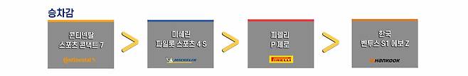이번 비교는 프리미엄 스포츠 타이어다. 고성능 차에 쓰이는 타이어로 이해하면 된다.