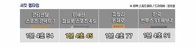 서킷은 태백 스피드웨이다. 단조롭게 보이지만 제동, 고속 코너 덕분에 타이어 성능 편차를 보기에 무리 없다. 다만 거리가 짧아 성능 차이 대비 랩타임 편차가 작아 보일 수 있다.