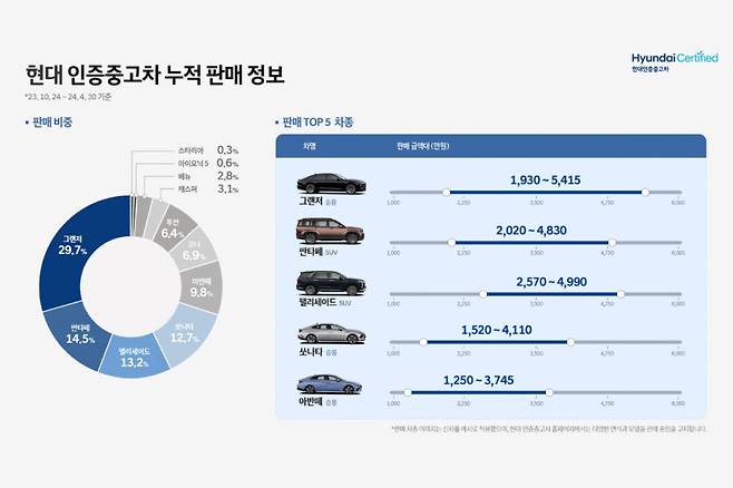 현대차는 지난해 10월 시작한 인증중고차 사업에서 지난 4월 30일 누적 기준 현대 그랜저(29.7%), 싼타페(14.5%), 팰리세이드(13.2%) 순서로 판매 비중이 높았다고 밝혔다.