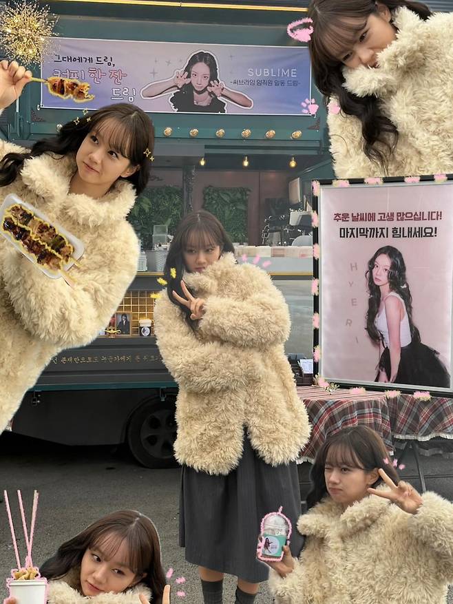 혜리는 16일 자신의 SNS에 "닭꼬치에 진심인 편 맛있는 간식 먹고 힘낼게요!!!! 감사합니다"라는 문구와 함께 소속사 '써브라임'에서 보낸 간식차 인증샷을 게재했다.
