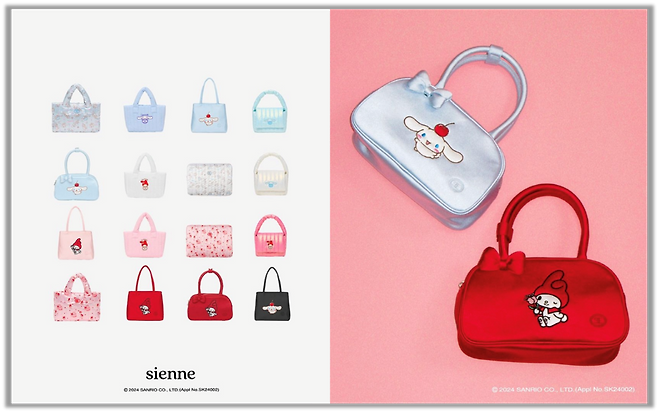 이디야, 케이스티파이, 에버랜드 등 산리오가 콜라보한 사례가 굉장히 많은데, 그 중에서도 패션 브랜드 시엔느 X 산리오의 협업이 눈에 띄더라. 시엔느의 패딩백에 시나모롤과 마이멜로디가 그려진 게 귀여웠거든. 각 캐릭터와 어울리는 가방의 색과 디자인이 각 캐릭터와 잘 어울렸는데, 관심있는 사람들은 참고해(광고 X)!