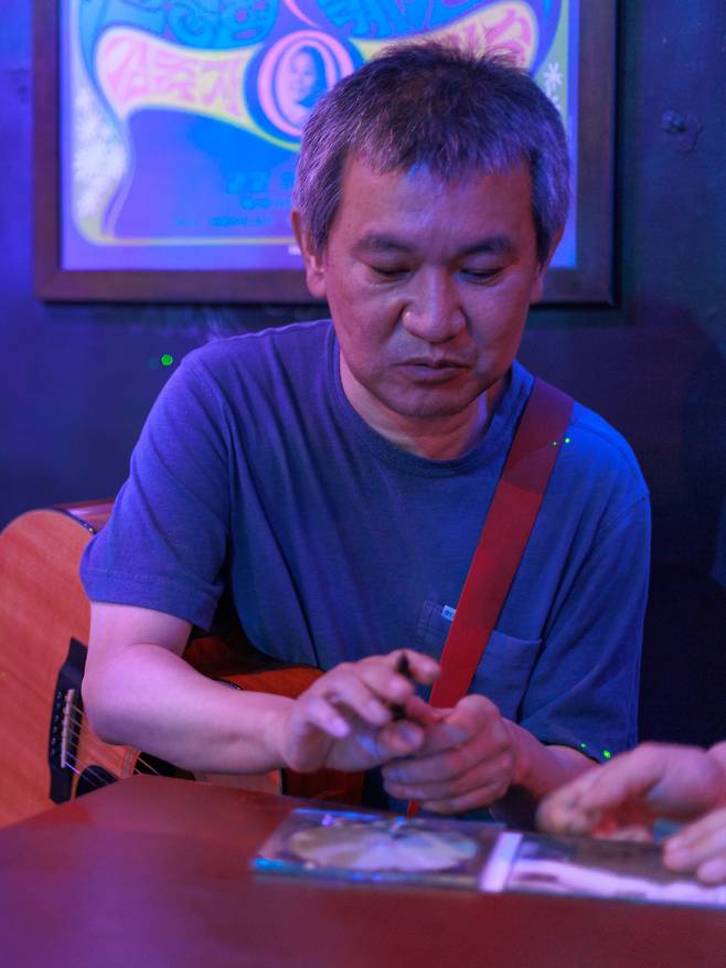 “정인기라고 연기하는 친구가 있는데 저와 동갑내기예요. 어느 날 그 친구가 기타를 배우고 있다면서 같이 다니자고 하더라고요. 둘이 기타를 배우면서 노래를 만들고 공연을 했어요. 〈기타만 메고 다녔지〉, 〈지가 무슨 한대수인 줄 알고〉, 〈뭐 없나〉 그런 노래들인데, 그게 다 둘이서 막걸리 마시다 만든 음악이에요.”