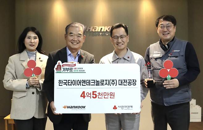 한국타이어는 24일 오후 대전시 대덕구 목상동 소재 한국타이어 대전공장에서 이준길 한국타이어 대전공장장, 유재욱 대전사회복지공동모금회 회장 등이 참석한 가운데 이웃사랑 성금 4억 5천만 원을 대전사회복지공동모금회에 기탁했다.