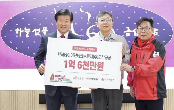 앞선 이날 오전에는 충남 금산군청을 방문하여 오상현 한국타이어 금산공장장, 박범인 금산군수, 유병설 충남사회복지공동모금회 사무처장 등이 참석한 가운데 성금 1억 6천만 원을 충남사회복지공동모금회에 전달했다.