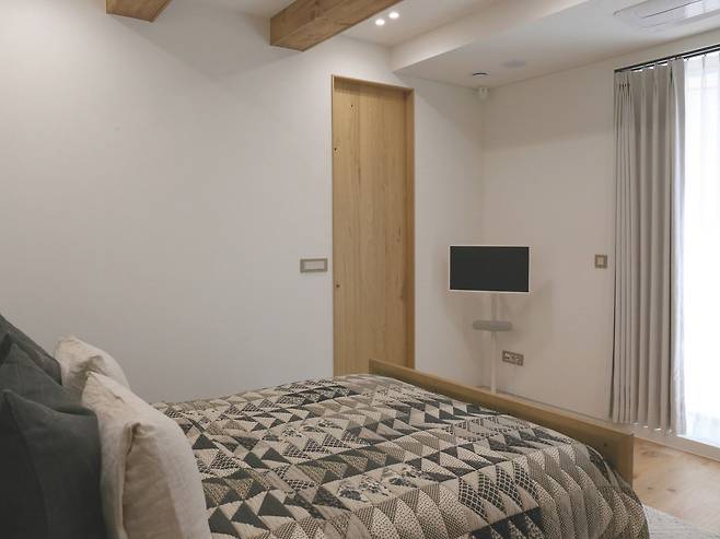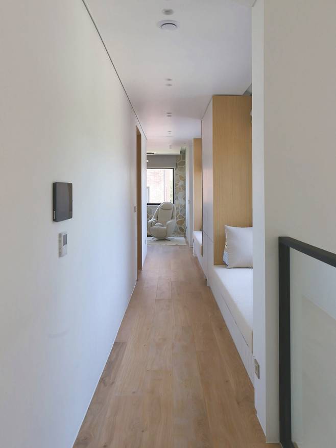 두 개 층 높이에 맞춘 창이 설치된 계단실을 훑어보며 2층으로 오르면 긴 복도를 마주한다. 복도 끝에는 서재와 이를 기준으로 양옆에 하나씩 게스트용 침실이 위치한다. 단순하게 침대만 있는 것이 아니라 아담한 옷장과 화장실도 포함해 더욱 프라이빗하고 쾌적하게 이용할 수 있다.