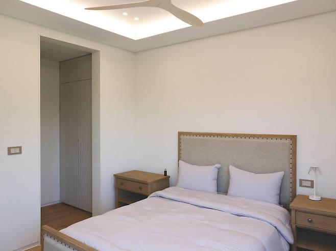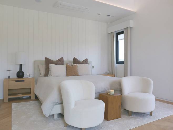 브라이언이 사용할 메인 침실은 계단실에서 올라오면 바로 마주하는 동선에 있다. 침실에 널찍한 드레스룸과 욕실을 포함한 마스터룸 개념으로 완성했다. 특히, 침실은 박공지붕을 높게 살리고 발코니도 연계해 쾌적한 개방감이 돋보이는 곳이다. 아이보리 톤의 마감과 실링팬이나 소품 등이 전체적으로 편한 휴식을 취하기 좋은 분위기를 연출한다. 드레스룸은 그의 패션 감각을 엿볼 수 있는 옷과 각종 액세서리를 보관할 유리장으로 계획했다. 조명이 아이템을 더욱 멋스럽게 자랑하는 듯하다.