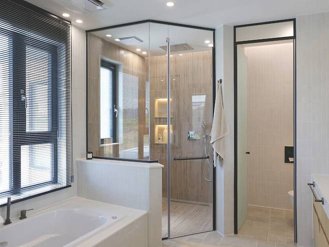 그 안쪽으로 널찍한 욕실이 이어진다. 샤워실과 화장실을 한 공간에 배치했지만 벽과 문으로 완전히 구분해 쾌적한 사용을 도모했다. 조적 욕조에서는 어쩐지 거품 목욕 속에서 샴페인 한 잔 들고 있을 그의 모습이 그려진다. 밝은 햇살이 스미는 것에 맞춰 전체적으로 화이트 톤을 바탕에 두고 조명을 설치하거나 수전 및 거울, 프레임을 블랙 컬러로 선정해 세련됨도 더했다.