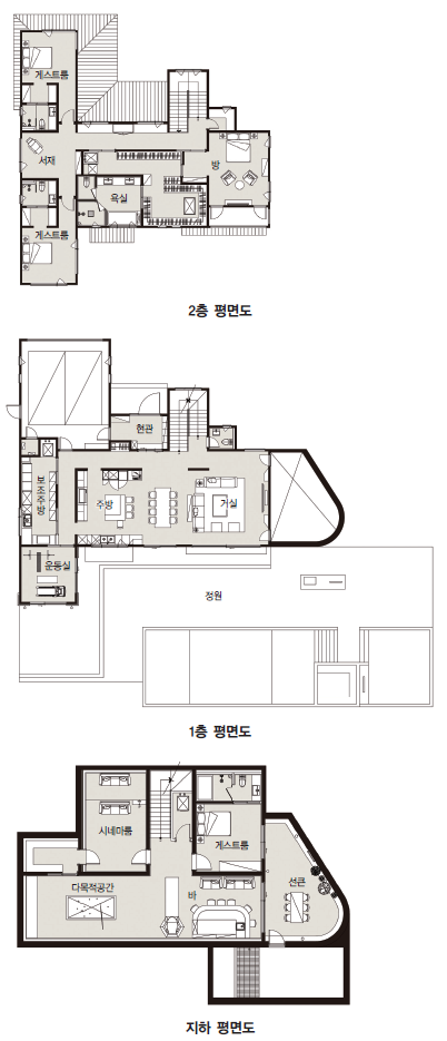 이곳에 그가 계획한 집에는 실내에서 온종일 보내라 하면 충분히 그러겠노라 답할 수 있을 만큼 온갖 시설이 전부 들어가 있다. 외부 수영장과 바비큐장은 당연하고 시네마룸부터 바와 당구장까지 갖춰진 다목적 공간도 있다. 전용 화장실을 갖춘 게스트룸까지 총 세 곳에 계획했으니 가족과 지인들을 초대해 맘껏 놀기에도 그만이다.