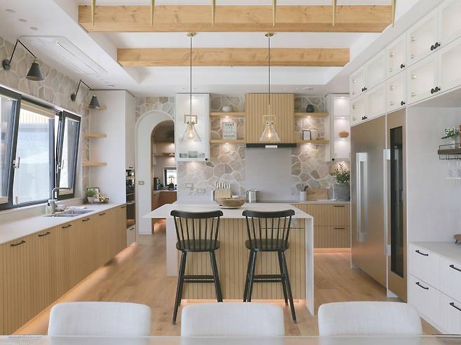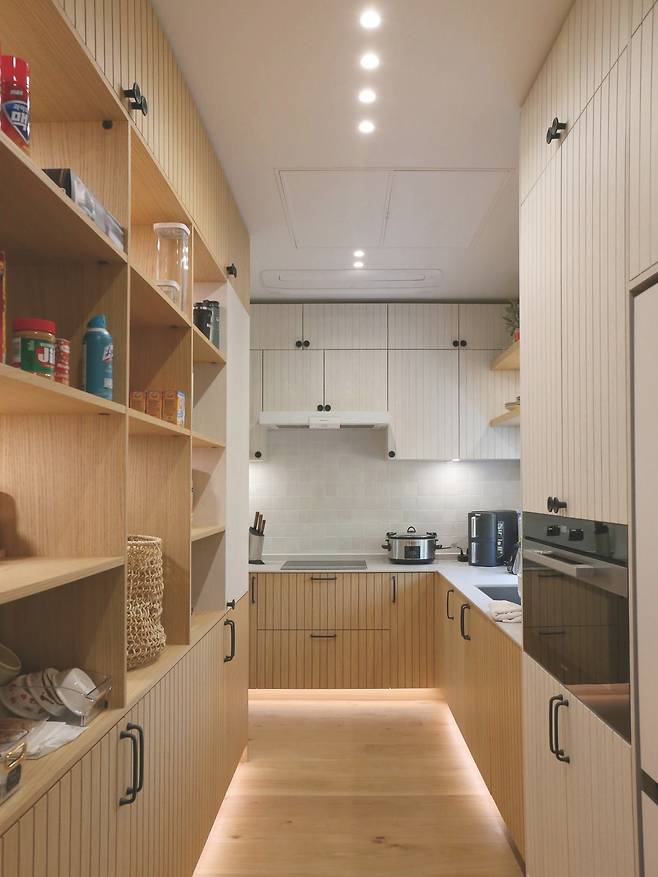 주방은 조리를 위한 메인 주방과 수납을 위한 보조 주방으로 구성했는데, 보조 주방을 메인 주방 뒤로 숨겨 깔끔함과 효율성을 높였다. 특히, 보조 주방은 메인 주방과 현관 앞 전실 복도에 각각 개구부를 하나씩 마련해 필요에 따라 진출입을 다르게 할 수 있는 순환 동선을 그린다.