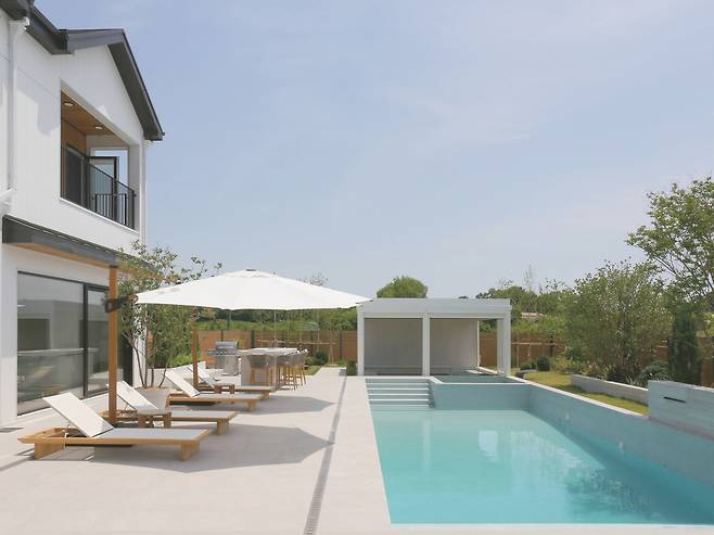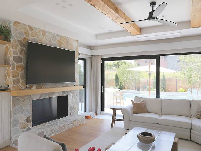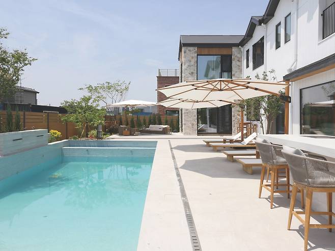거실은 외부에서 본 모자이크 패턴의 벽돌 마감을 아트월로 활용하고 벽난로도 계획해 언뜻 보면 리조트가 연상된다. 리조트가 연상되는 이유는 이뿐만이 아니다. 시선을 옆으로 옮기면 선베드와 파라솔이 놓인 수영장이 바라보이기 때문이다. 때로는 퍼걸러나 야외 소파에서 독서를 즐기거나 맥주 한 캔을 따도 좋을 것이다.