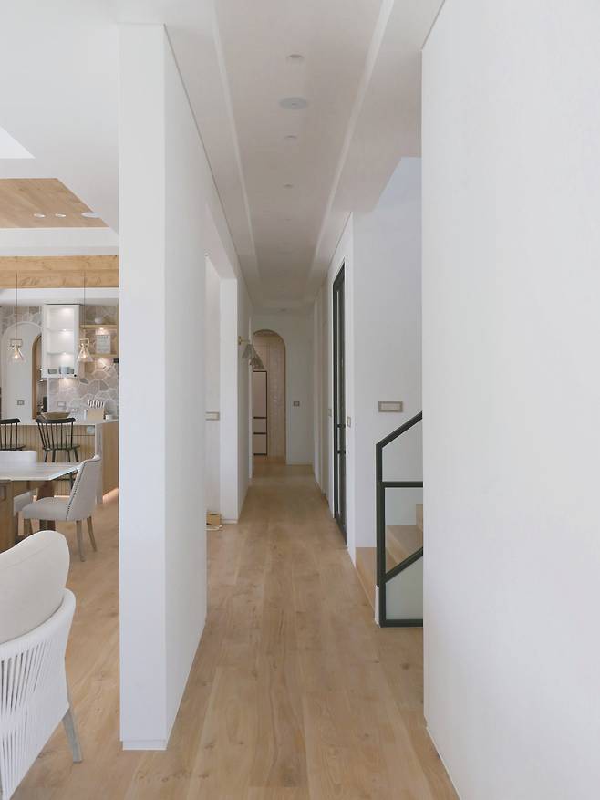 1층은 공용공간으로 거실, 주방+식당이 넓게 자리한다. 각 영역을 구분하지 않고 일직선으로 배치하고 천장부에 목구조 보를 드러낸 것을 제외한, 특별한 마디를 두지 않아 더욱 탁 트인 시야가 시원하다. 외부에서도 느낄 수 있던 자재의 밝은 톤을 실내에도 그대로 적용해 전체적으로 밝고 왠지 나른해지는 듯한 코지cozy한 분위기를 연출한다.