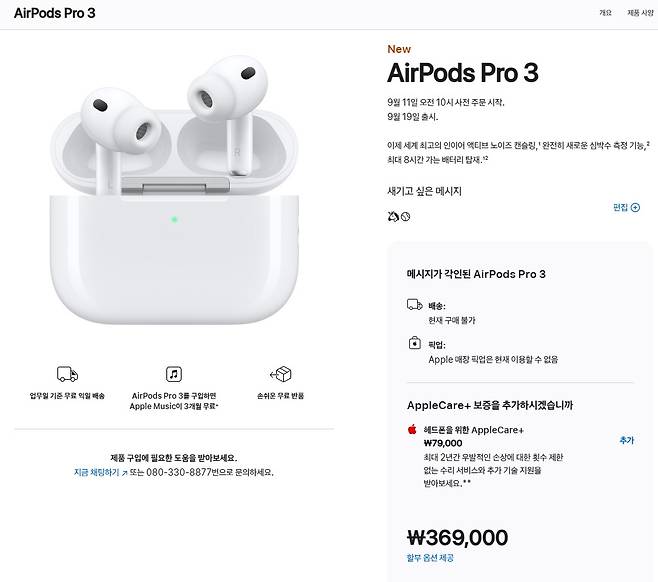 에어팟 프로 3의 국내 예약 판매가격은 36만 9천원으로 사전 예약은 9월 11일 오전 10시부터 가능하다. 출시 예정은 오는 9월 19일이다.