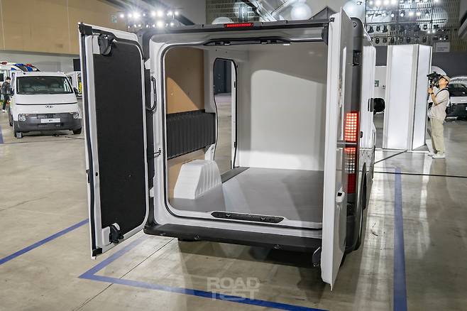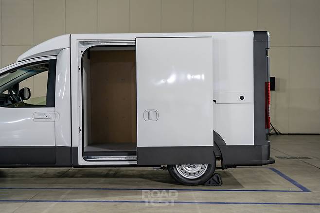 적재함 왼쪽에는 슬라이딩 도어를, 뒷면에는 트윈 스윙 도어를 달았다. 잠금 방식은 일반적인 승용차와 같은 전동식. 포터의 걸쇠 형태보다 쓰기 간편하고 겉으로 보기에도 깔끔하다. 후면 트윈 스윙 도어는 기본적으로 90°에서 고정할 수 있다. 고정 장치를 풀면 최대 258°까지 열리며, 자석 내장형 스토퍼 덕분에 활짝 열어도 문짝이 흔들리지 않는다. 리어 범퍼에는 높이 380㎜의 일체형 보조 스텝을 달아 적재함에 드나들기도 쉽다.
