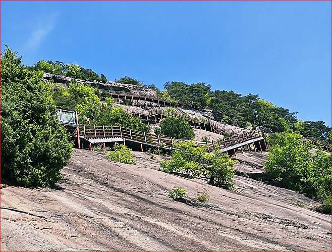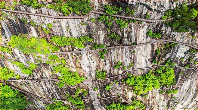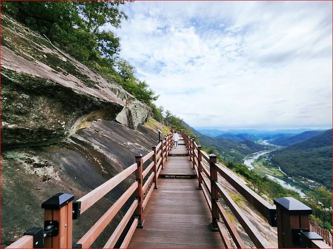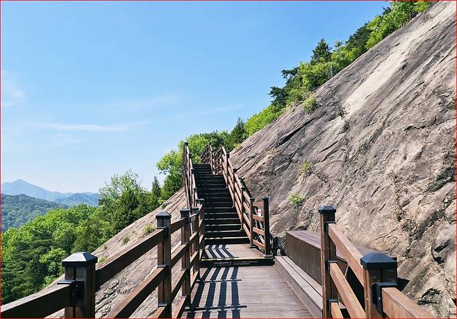 매표소를 지나 약 10분간 돌계단을 오르면, 수직 암벽 위를 따라 설치된 하늘길의 시작점에 도달합니다. 길 중간중간에는 편안한 쉼터와 전망대, 그리고 등산객을 위한 글귀가 새겨진 데크 계단이 있어 걷는 재미를 더합니다.