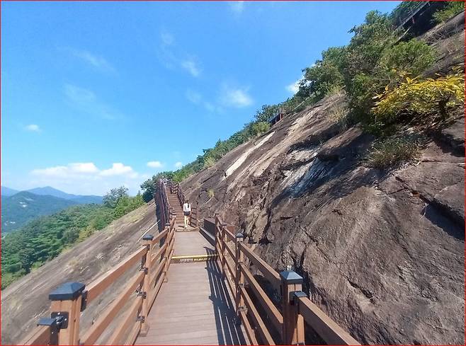 처음에는 534m였던 데크가 562m 추가 연장되며 총 1,096m의 산악 잔도로 재탄생했는데요, 바위를 타고 이어지는 길은 걷는 내내 긴장과 감탄이 교차합니다. 입구부터 약 10분간 돌계단을 따라 오르면 본격적인 하늘길이 시작됩니다.