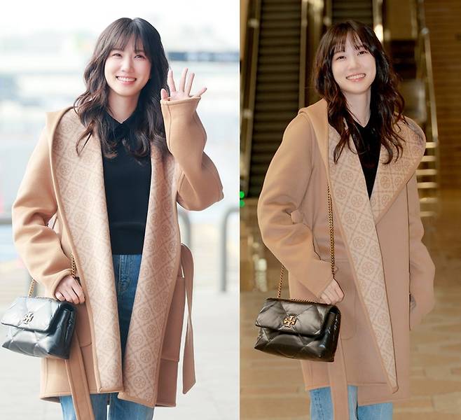 이날 박은빈은 넉넉하고 여유로운 사이즈의 화사한 베이지 후드 하프 코트와 니트 티셔츠, 청바지를 스타일링해 청순한 꾸안꾸룩을 연출했다.