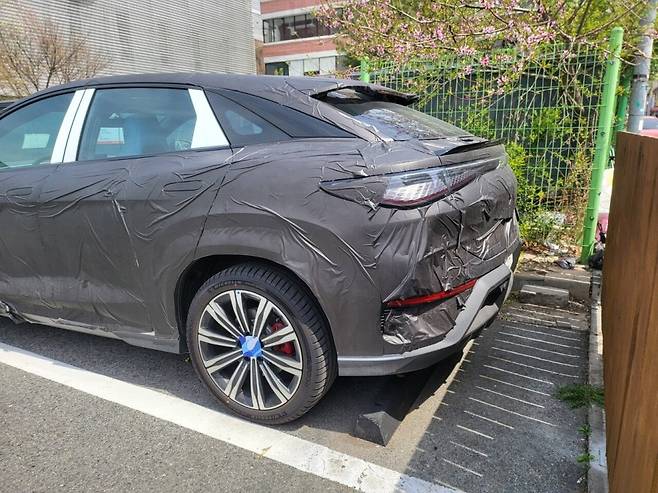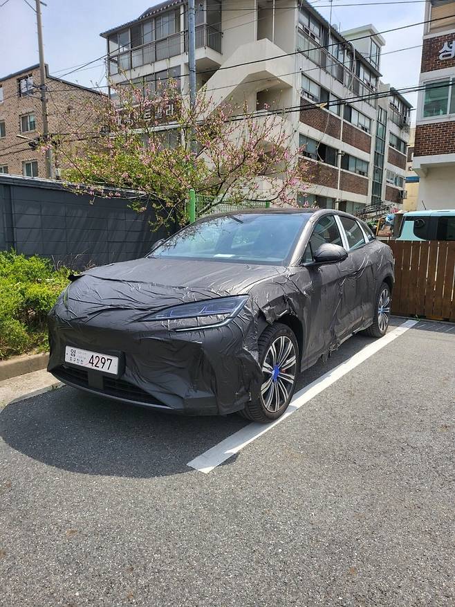 인터넷 커뮤니티 에펨코리아에는 최근 중국 BYD의 전기차 씨라이언7이 서울 중구 임시 번호판을 달고 위장 스티커를 붙인 채 주차된 사진이 등장했다.
