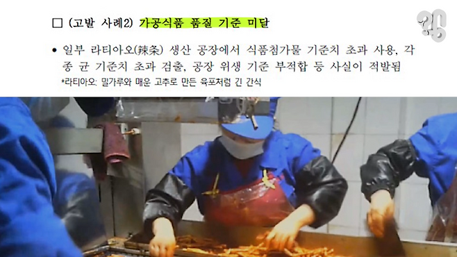 검사를 한다고 하니 일단 안심인데, 찾아보니 중국 간식 라티아오는 2019년에 중국 관영 CCTV에서 진행하는 소비자 고발 프로그램에서 위생 문제로 적발된 적이 있었다. 식품 첨가물 기준치 초과 사용, 각종 균 기준치 초과 검출, 공장 위생 기준 부적합 등 사실이 적발된 바 있기 때문. 그럼 국내에 라티아오가 이 문제의 공장에서 왔는지 알 수 있는지 물어봤는데 쉬운 일이 아니라 한다.