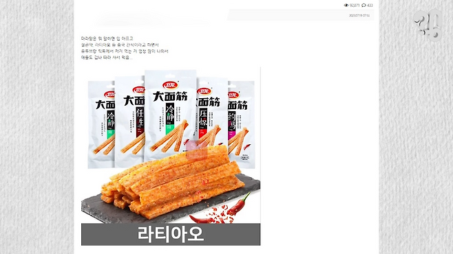 검사를 한다고 하니 일단 안심인데, 찾아보니 중국 간식 라티아오는 2019년에 중국 관영 CCTV에서 진행하는 소비자 고발 프로그램에서 위생 문제로 적발된 적이 있었다. 식품 첨가물 기준치 초과 사용, 각종 균 기준치 초과 검출, 공장 위생 기준 부적합 등 사실이 적발된 바 있기 때문. 그럼 국내에 라티아오가 이 문제의 공장에서 왔는지 알 수 있는지 물어봤는데 쉬운 일이 아니라 한다.