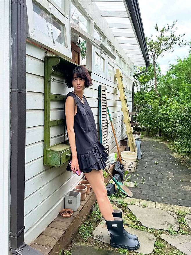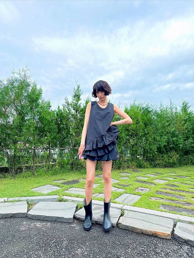이번 스타일링의 핵심은 단연 레인부츠와의 믹스매치다. 여성스러운 러플 원피스에 투박한 디자인의 블랙 레인부츠를 과감하게 조합해, 힙하면서도 유니크한 '꾸안꾸' 스타일을 완성했다. 이는 장마철 실용성은 물론 트렌디함까지 놓치지 않는 나나의 뛰어난 패션 센스를 보여준다. 여기에 짧은 단발머리와 심플한 목걸이로 마무리해 드레스 자체의 매력에 시선이 집중되도록 했다.