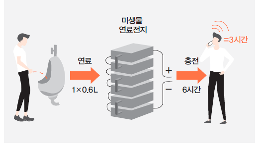 황당한 소리로 들리겠지만 사실이다. 오줌으로 휴대전화를 충전하고 전등을 밝히는 기술이 이미 개발되었다. 2015년 영국 브리스톨웨스트잉글랜드대학교의 한 연구진이 소변기에 MFC를 달아 화장실 한 칸을 밝히는 데 충분한 전기를 생산했다. 그리고 1년 뒤에는 휴대전화 충전에도 성공했다.
