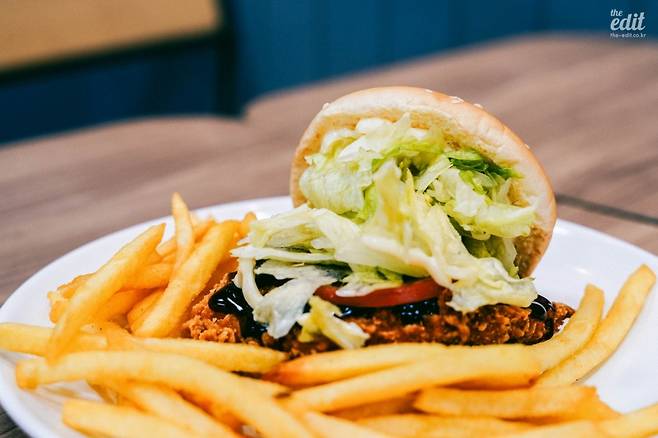 핫크리스피 버거 + 치즈 토핑 추가_ 기름에서 갓 나온 치킨 패티의 열기에 녹아, 녹진해진 치즈 토핑이 핫 크리스피 버거의 매운 맛을 눌러주고, 치즈의 고소한 맛이 일품.