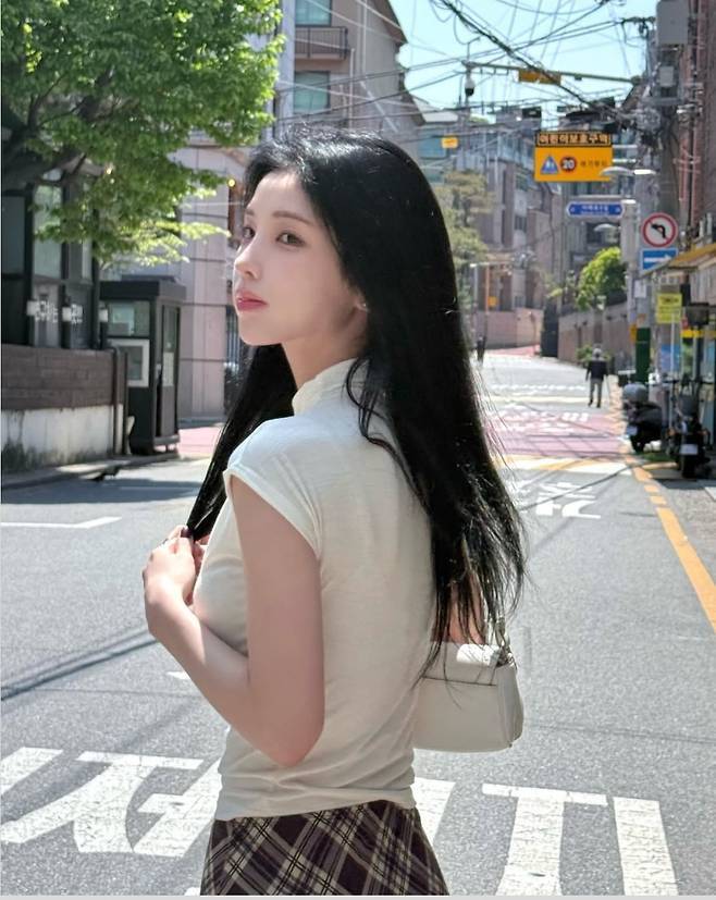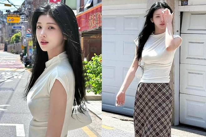 강다은은 크림빛 하이넥 슬림 티셔츠에 브라운 계열 체크 롱스커트를 매치해 우아하면서도 캐주얼한 무드를 완성했습니다.