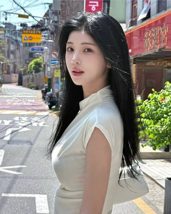자연스럽게 흩날리는 긴 흑발과 맑은 피부가 그녀만의 청초한 매력을 한층 배가시켰습니다.