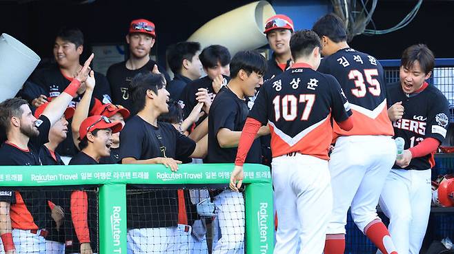 ▲ KIA 타이거즈와 LG트윈스의 경기에서 6회 초 원아웃 주자 2, 3루 상황 2타점 3루타를 날리고 대주자로 교체된 KIA 김석환이 더그아웃에서 팀동료들과 환호하고 있다.