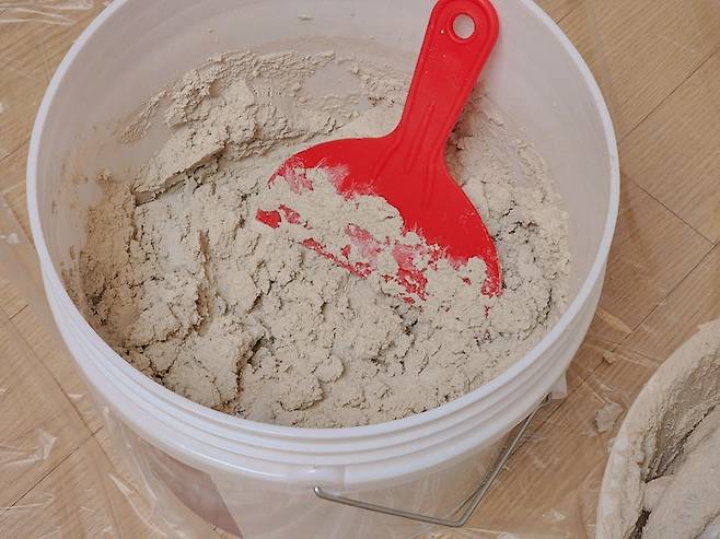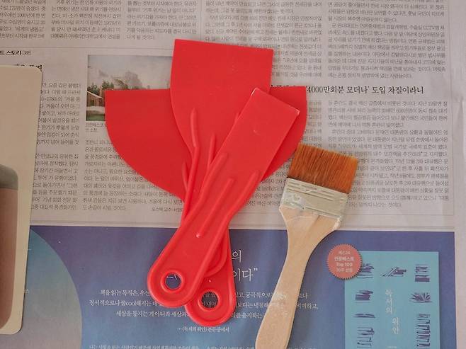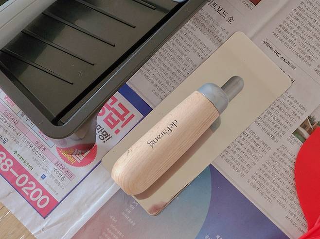 그 외에 3P에 천원 짜리 다이소 플라스틱 스크래퍼도 아주 유용하게 사용했어요. 미장재를 조금씩 떠서 트로웰에 올리는 용도로 딱이더라고요.
