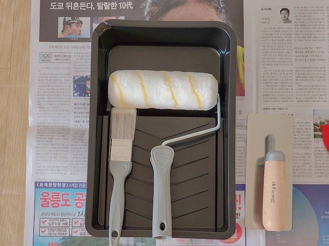 시공 전날 쿠팡에서 급히 구입한 코멧 붓/롤러/트레이 세트, 그리고 드파랑에서 구입한 트로웰(흙손)이예요. 붓/롤러/트레이 세트는 프라이머를 바르기 위해 꼭 필요한 준비물이예요. 프라이머는 페인트처럼 주르륵 흐르는 묽은 질감이라 붓이나 롤러로 발라야 하거든요.