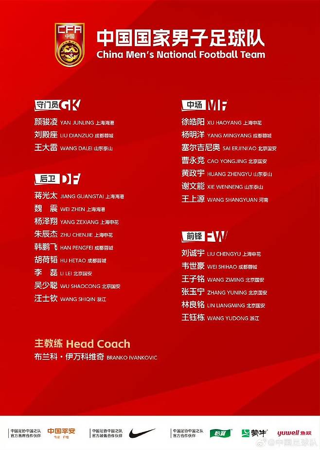 '축구보'에 따르면 중국 대표팀 사령탑 브란코 이반코비치 감독은 공격수 포지션에 류청위(상하이 선화), 웨이스하오(청두 룽청), 왕즈밍, 장위닝, 린량밍(이상 베이징 궈안), 그리고 중국 축구계가 기대하고 있는 19세 유망주 왕위둥(저장FC)을 선발했다.